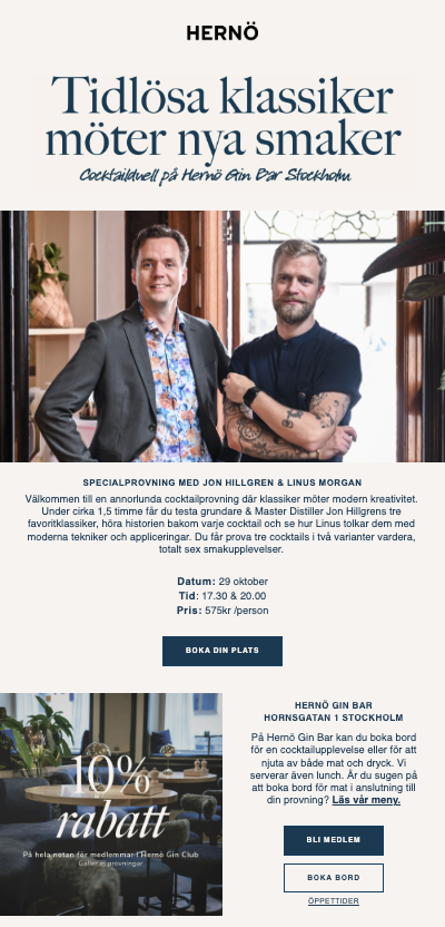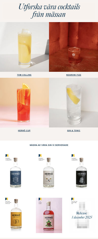 The team at Hernö Gin is very selective about what it sends out to its target audience. The newsletters serve as an extension of the brand. The goal is to inspire, build relationships, and drive additional sales. Each mailing is visually well thought out, intuitive, and click-friendly. By tracking statistics and click behavior, they see exactly what subscribers appreciate most and tailor the content accordingly.